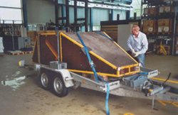 Am 03.05.2015 war es soweit. Eine Tour zum Bodensee, mit der Fähre nach Konstanz zur ETH Zürich in die Schweiz. Eine Vignette für den T4 und eine für den Anhänger waren an der Grenze nötig, um die Autobahn zu benutzen. Herr Bollinger hatte den Mess-Anhänger schon in der Forschungshalle bereitgestellt. Dort sah ich den Mess-ERAH zum ersten Mal live in voller Größe und war begeistert, so ein besonderes Exemplar zu bekommen.